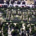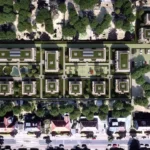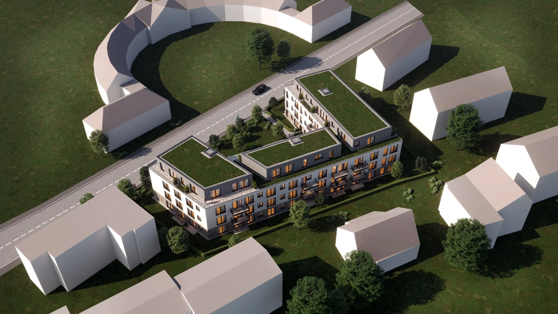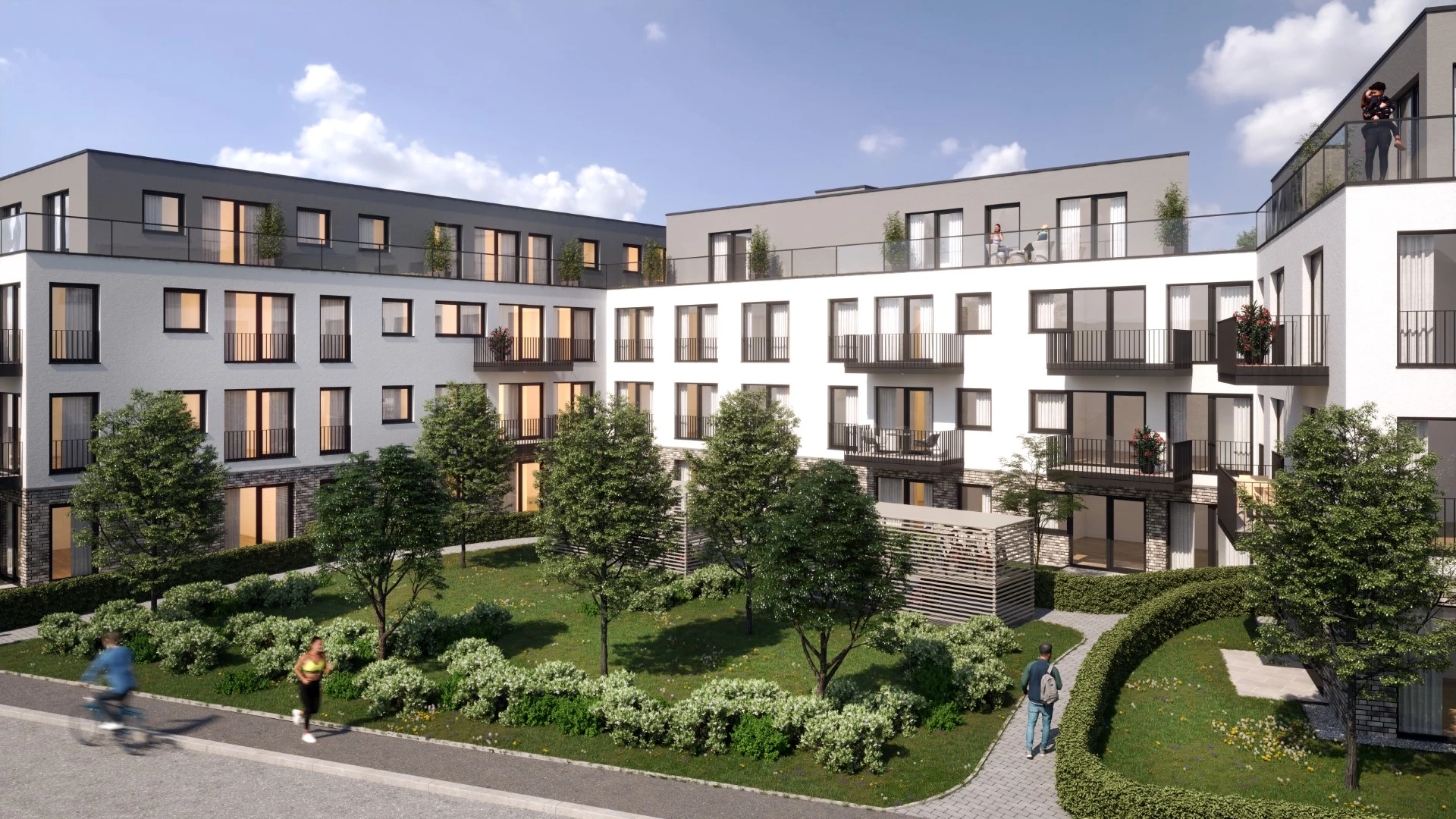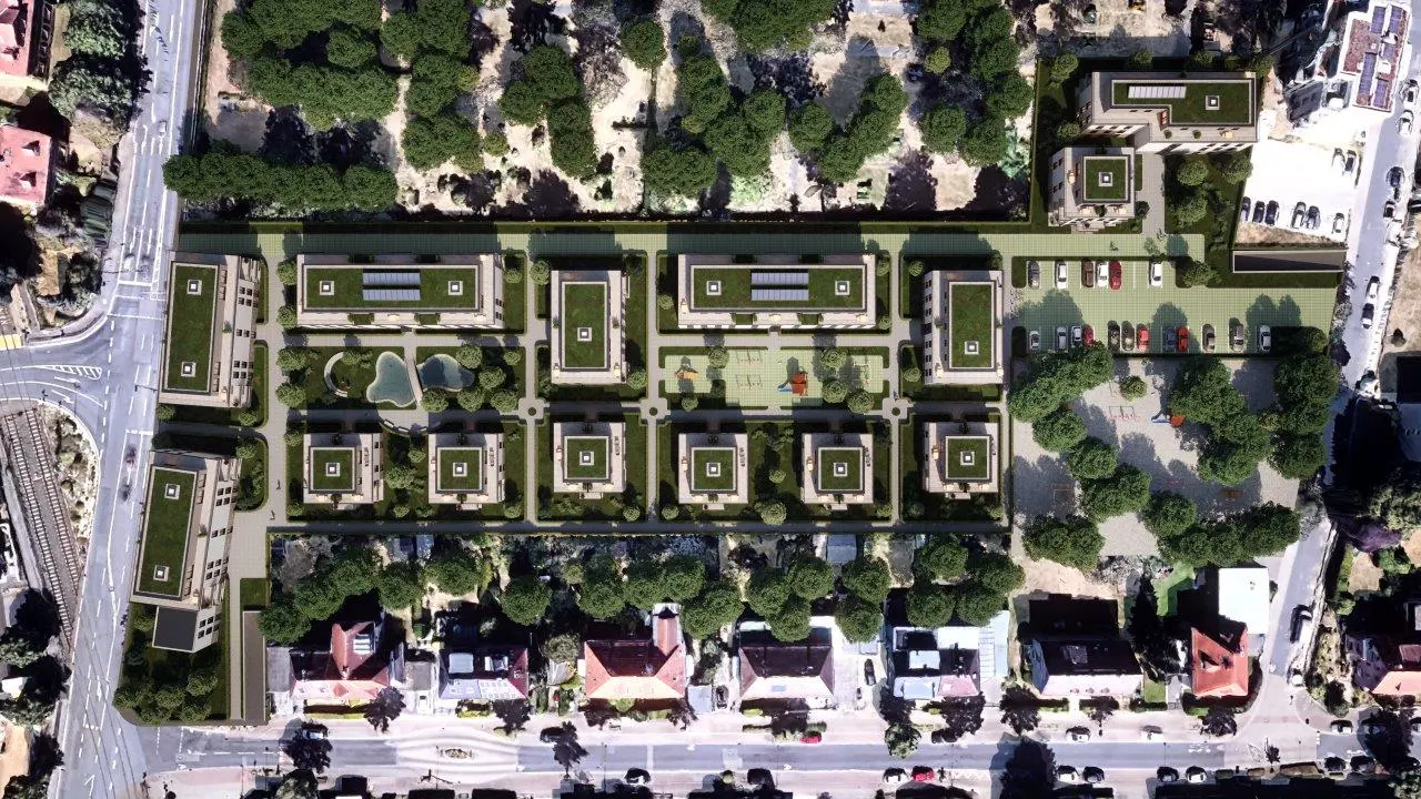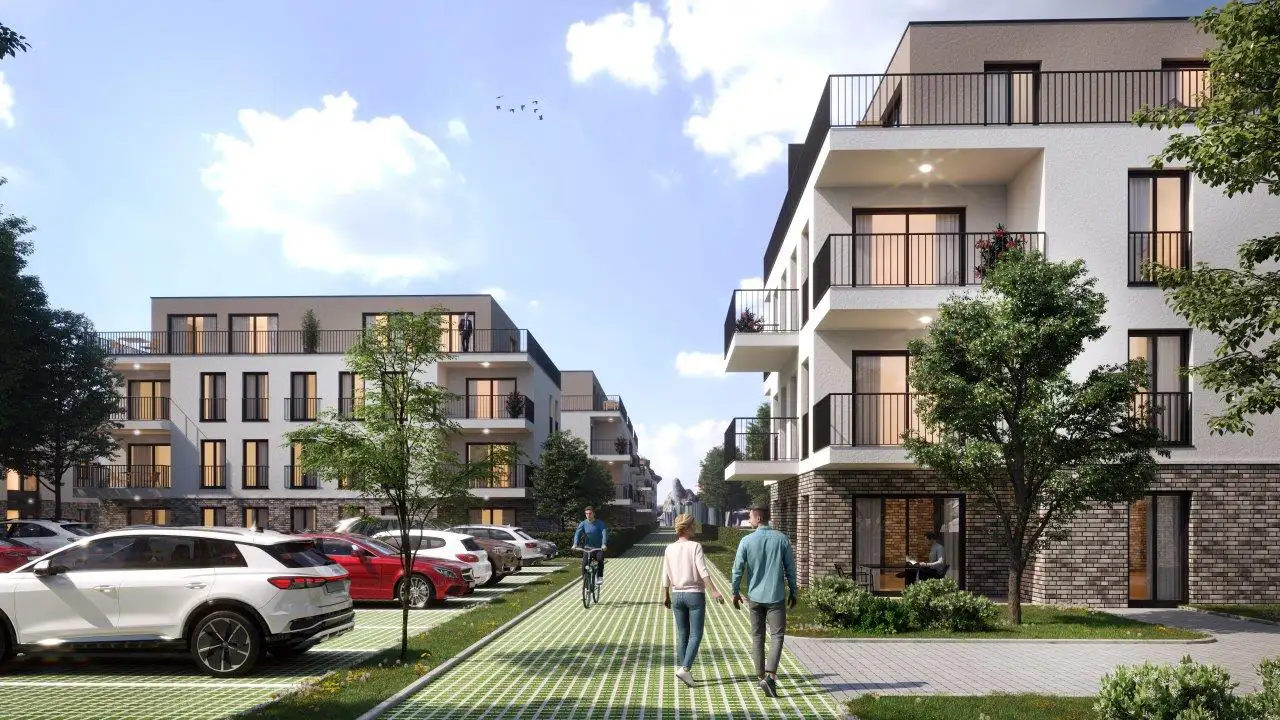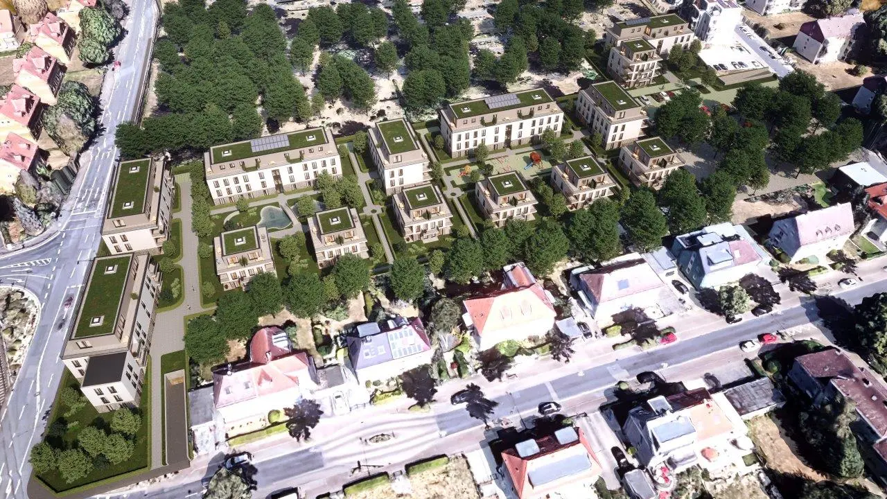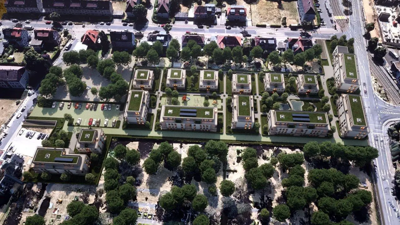 Prägendes architektonisches Gestaltungselement wird die Gliederung der Fassaden durch Vor- und Rücksprünge, welche zusätzlich durch zurückspringenden Loggien verstärkt wird. Die zwei bis dreigeschossigen Gebäude zzgl. Staffelgeschoß sind größtenteils als Wohngebäude konzipiert, beginnend von kleinen 1,5-Zimmer-Wohnungen bis hin zu großen 5-Zimmer-Wohnungen. Alle Wohnungen sind barrierefrei. Alle Gebäude erhalten Staffelgeschosse mit teilweise parkseitigen Dachterrassen. Im gesamten Baugebiet bilden die angrenzenden Gebäude einen Innenhof, welcher als begrünte Gemeinschaftsfläche mit integrierten Spielflächen und Feuchtbiotopen vorgesehen ist. An den Grenzen des Baugebiets orientieren sich als Ergänzung zur anliegenden öffentlichen Kinderspielplatz eine Kindertagesstätte und gegenüberliegend eine Betreute Wohnanlage. Ggf. können auch ein Arztzentrum und eine Geriatrie die Anlage vollenden. PKW-Stellplätze befinden sich komplett unterirdisch in einer Tiefgarage und werden teilweise für die Ausstattung mit Elektro-Ladesäulen vorgerüstet. Besucherstellplätze sind im oberen Feld der Gesamtanlage vorgesehen.