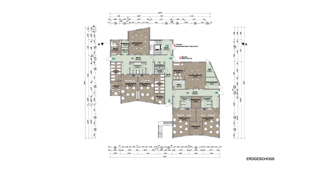 Der teils eingeschossige bzw. zweigeschossige Baukörper verfügt über zwei Vollgeschosse mit Flachdach und teils extensiver Dachbegrünung und. Fassadenelemente erhalten nachhaltige Konstruktionen. Im rückwärtigen Bereich öffnet sich das Gebäude in den Außenspielbereich der Kita. Der 2. Rettungsweg wird mittels großzügig dimensionierter Fluchtflachdachfläche sichergestellt. Diese dienen zugleich auch als direkter Gartenzugang. Im Eingangsbereich sind die Eltern- Wartezone als auch der räumlich abgetrennte Bewegungsraum angeordnet. Die Leitung ist in direkter Nähe gelegen. In einem abgetrennten Bereich auf dieser Ebene gibt es zwei U3-Gruppen. zwei weitere Ü3-Gruppen sind in einem weiteren abgetrennten Teil angeordnet. Hier befinden sich auch Aufbereitungsküche, Essbereich sowie ein Teil der Themen- und Funktionsräume für die größeren Kinder. Die übrigen Themenräume, wie auch Personalraum liegen unmittelbar in der Nähe. Abstellräume und Toiletten gibt es in allen Geschossen. Das Gebäude ist durch den Aufzug komplett barrierefrei erschlossen.