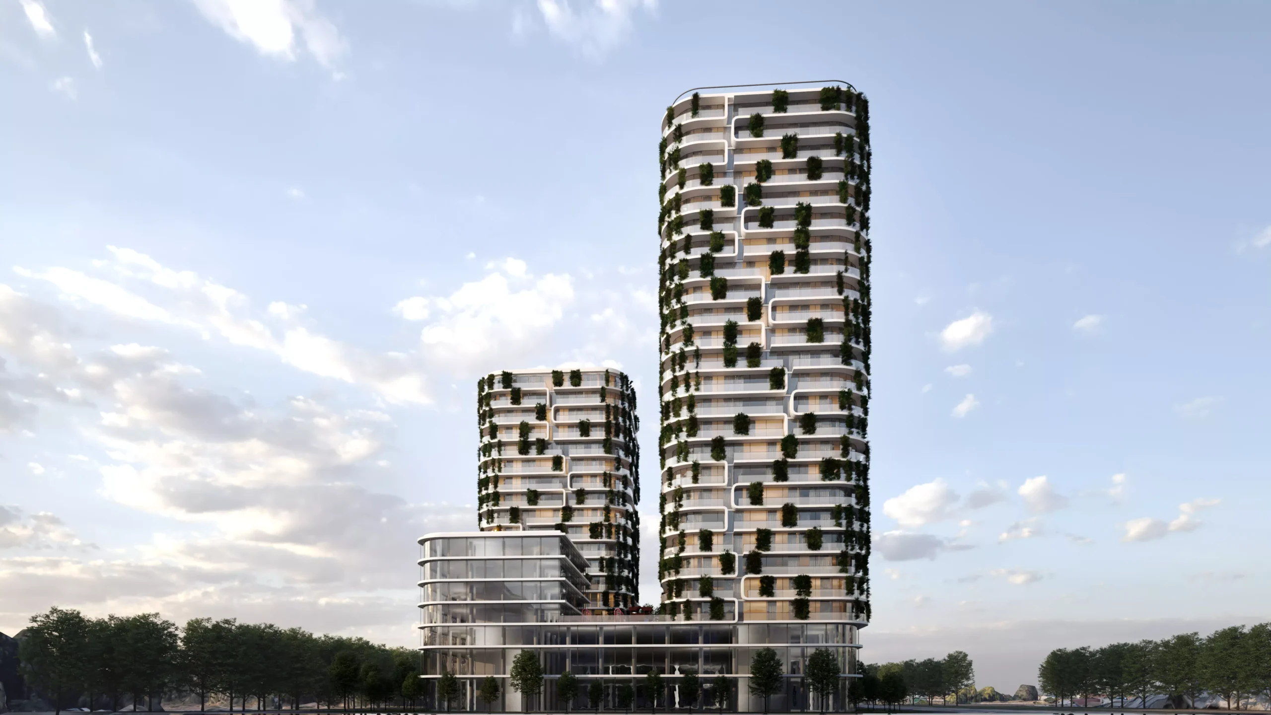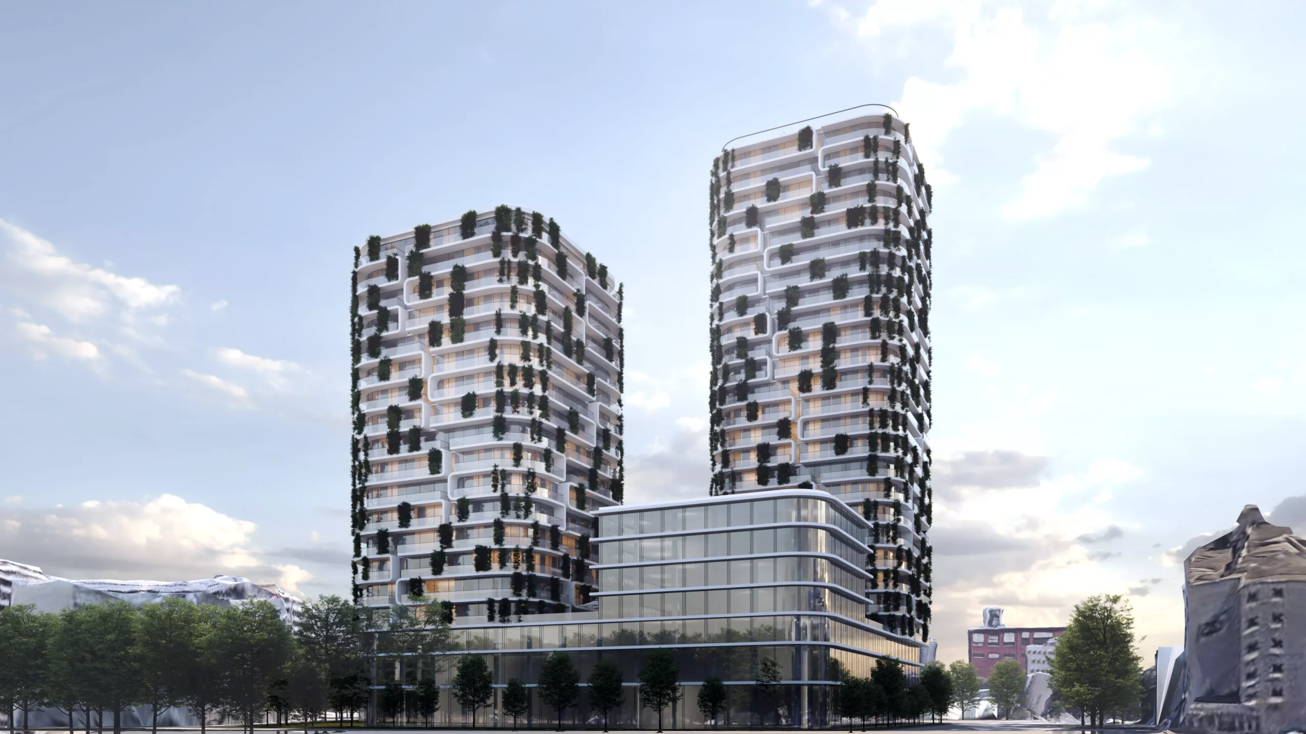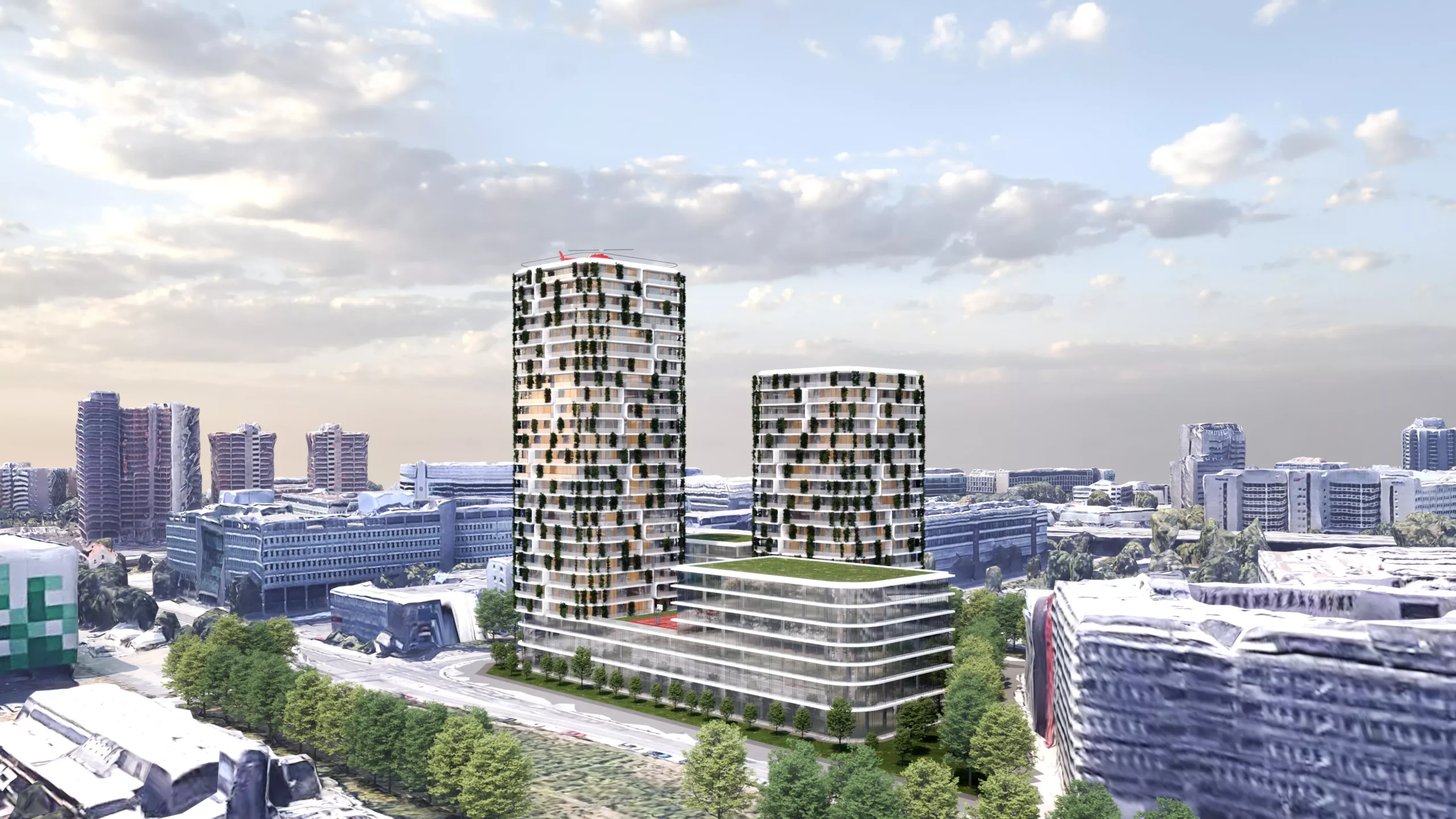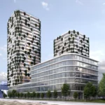 Konzept für einen multifunktionalen Wolkenkratzer in Offenbach zwischen Flughafen und Innenstadt. In der Basis des Gebäudes wird eine dreistöckige Shopping-Mall mit Einkaufszentrum, Restaurants und Unterhaltungsmöglichkeiten untergebracht. Oberhalb des Einzelhandels werden durch die beiden Tower teils 25 Wohngeschosse für Familien und Singles entstehen. Der oberste Teil der beiden Türme beherbergt jeweils drei Penthouse-Etagen in der Spitze. Insgesamt entstehen ca. 40.000,00 m² Nutzfläche.