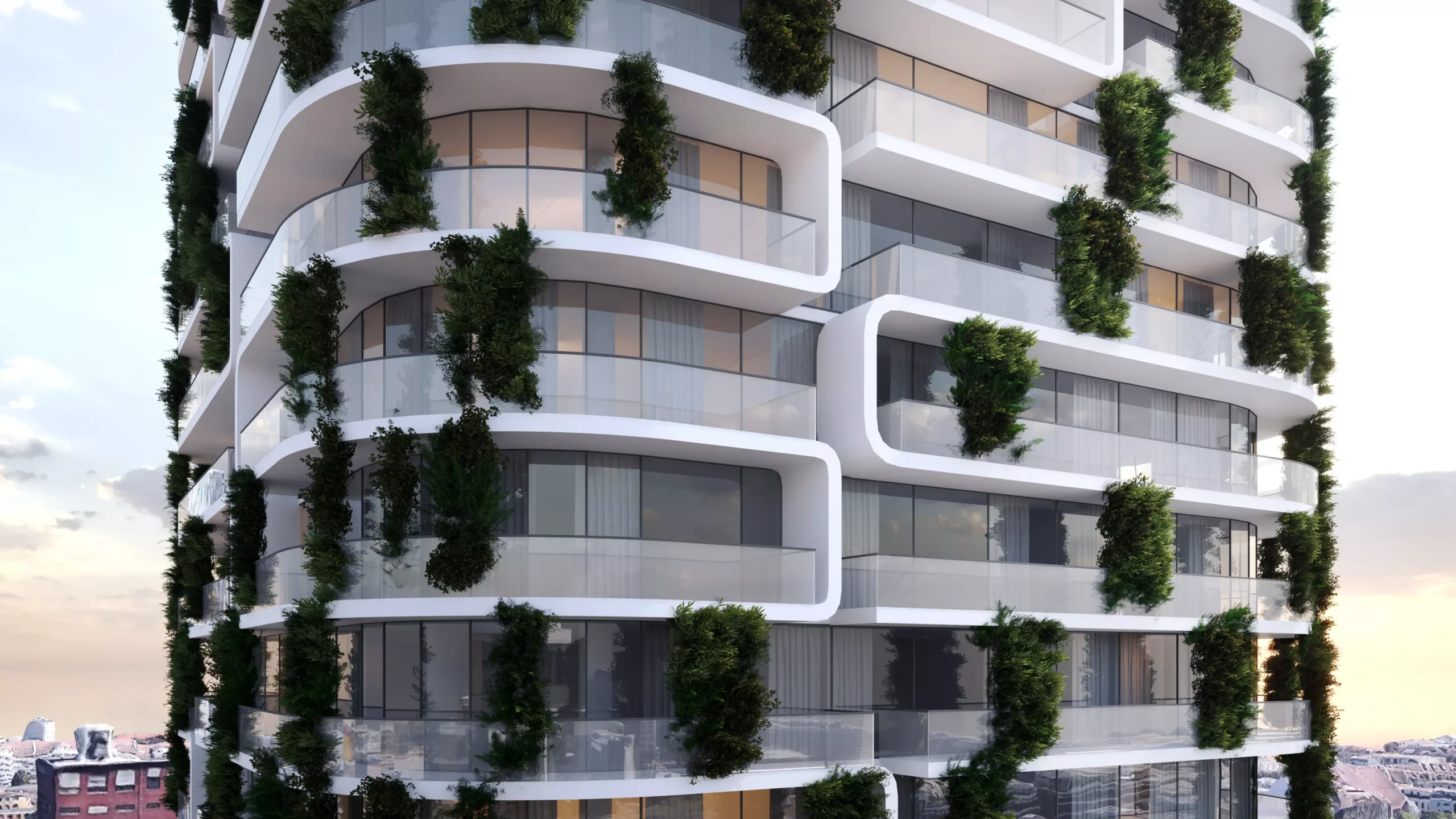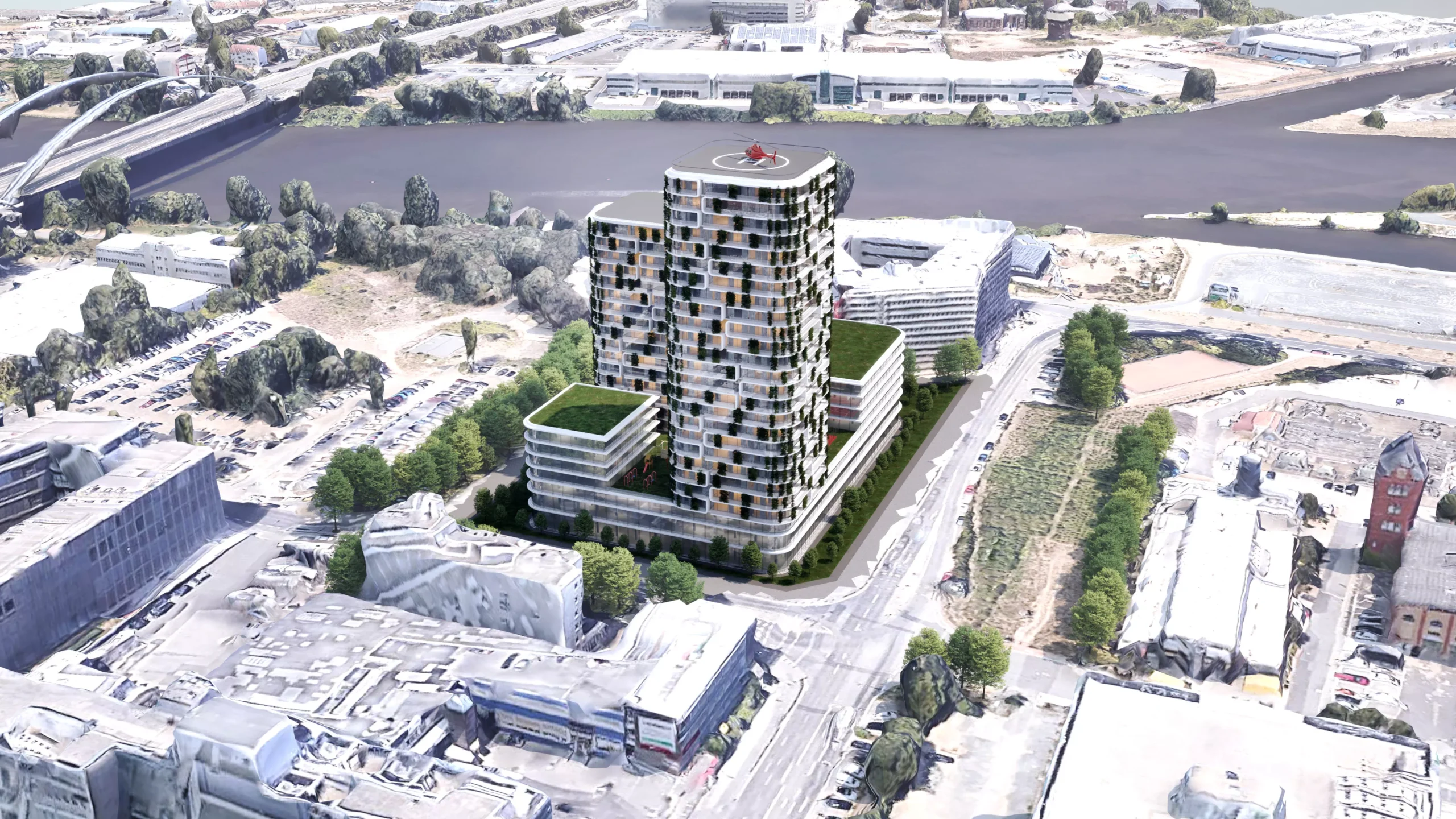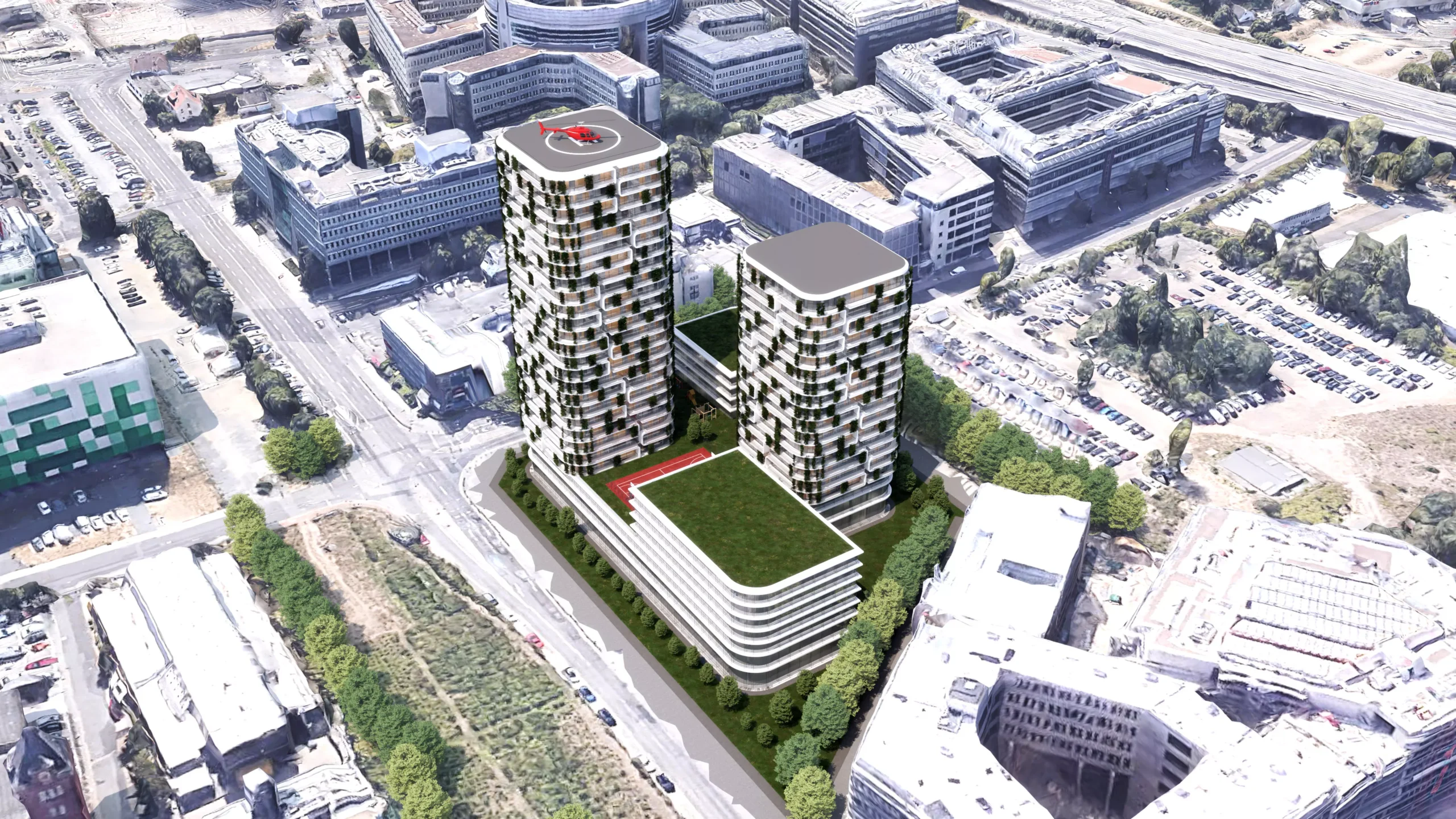 Konzept für einen multifunktionalen Wolkenkratzer in Offenbach zwischen Flughafen und Innenstadt. In der Basis des Gebäudes wird eine dreistöckige Shopping-Mall mit Einkaufszentrum, Restaurants und Unterhaltungsmöglichkeiten untergebracht. Oberhalb des Einzelhandels werden durch die beiden Tower teils 25 Wohngeschosse für Familien und Singles entstehen. Der oberste Teil der beiden Türme beherbergt jeweils drei Penthouse-Etagen in der Spitze. Insgesamt entstehen ca. 40.000,00 m² Nutzfläche.